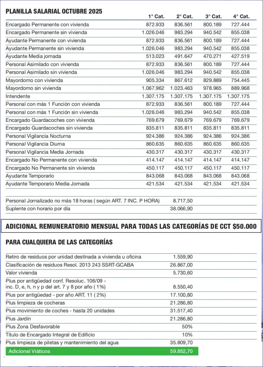 La Federación Argentina de Trabajadores de Edificios de Renta y Horizontal (FATERYH) acordó con las cámaras del sector empleador un incremento salarial del 1,7% para el mes de octubre de 2025.