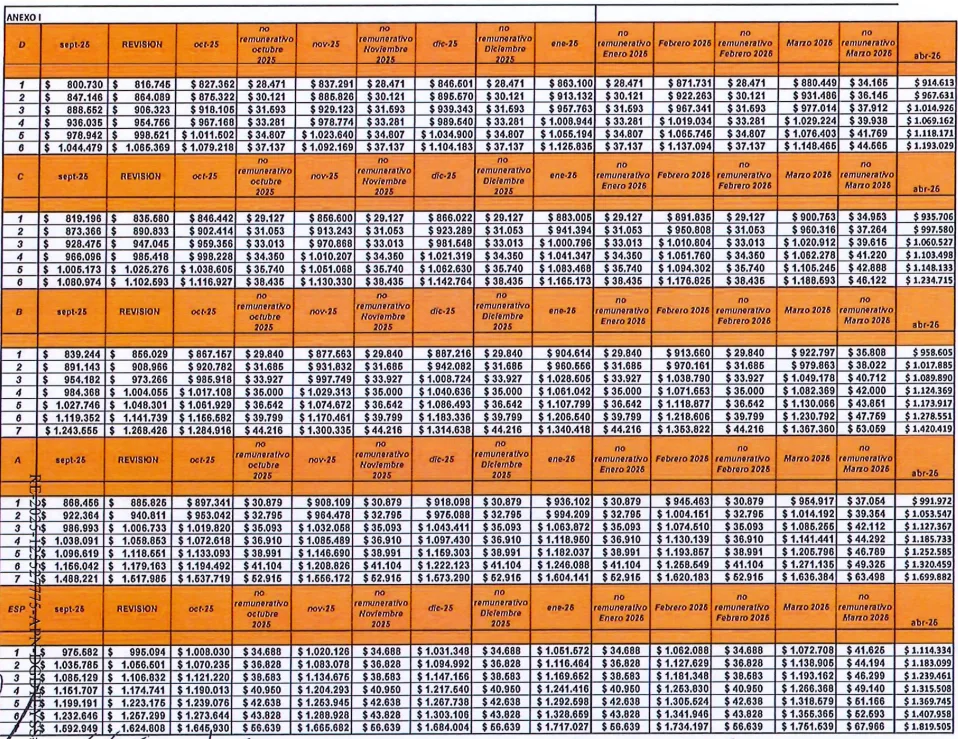 Los valores específicos están detallados en las tablas completas por categoría (A, B, C, D y Especial), con los montos remunerativos y no remunerativos correspondientes a cada mes.