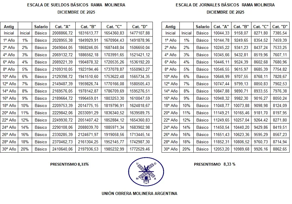 La Unión Obrera Molinera Argentina (UOMA) oficializó las nuevas escalas salariales para los trabajadores molineros correspondientes a diciembre de 2025.
