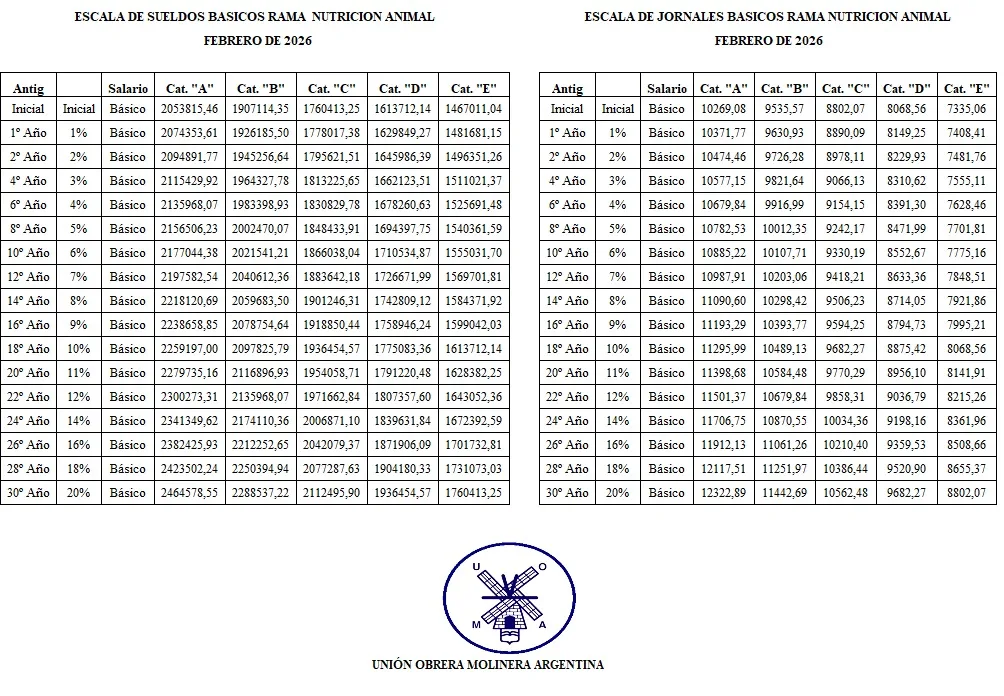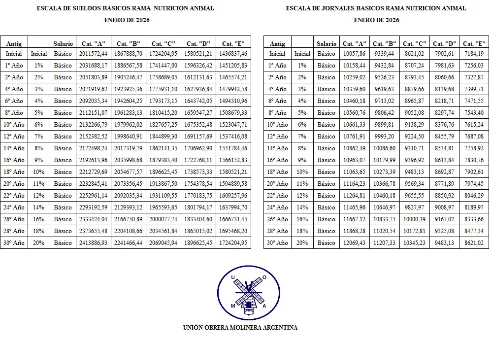 Los trabajadores de la rama Nutrición Animal comprendidos en el Convenio Colectivo de Trabajo Nº 66/89 tendrán nuevas escalas salariales en enero y febrero de 2026, tras el último acuerdo entre la Cámara Argentina de Empresas de Nutrición Animal (CAENA) y la Unión Obrera Molinera Argentina (UOMA).