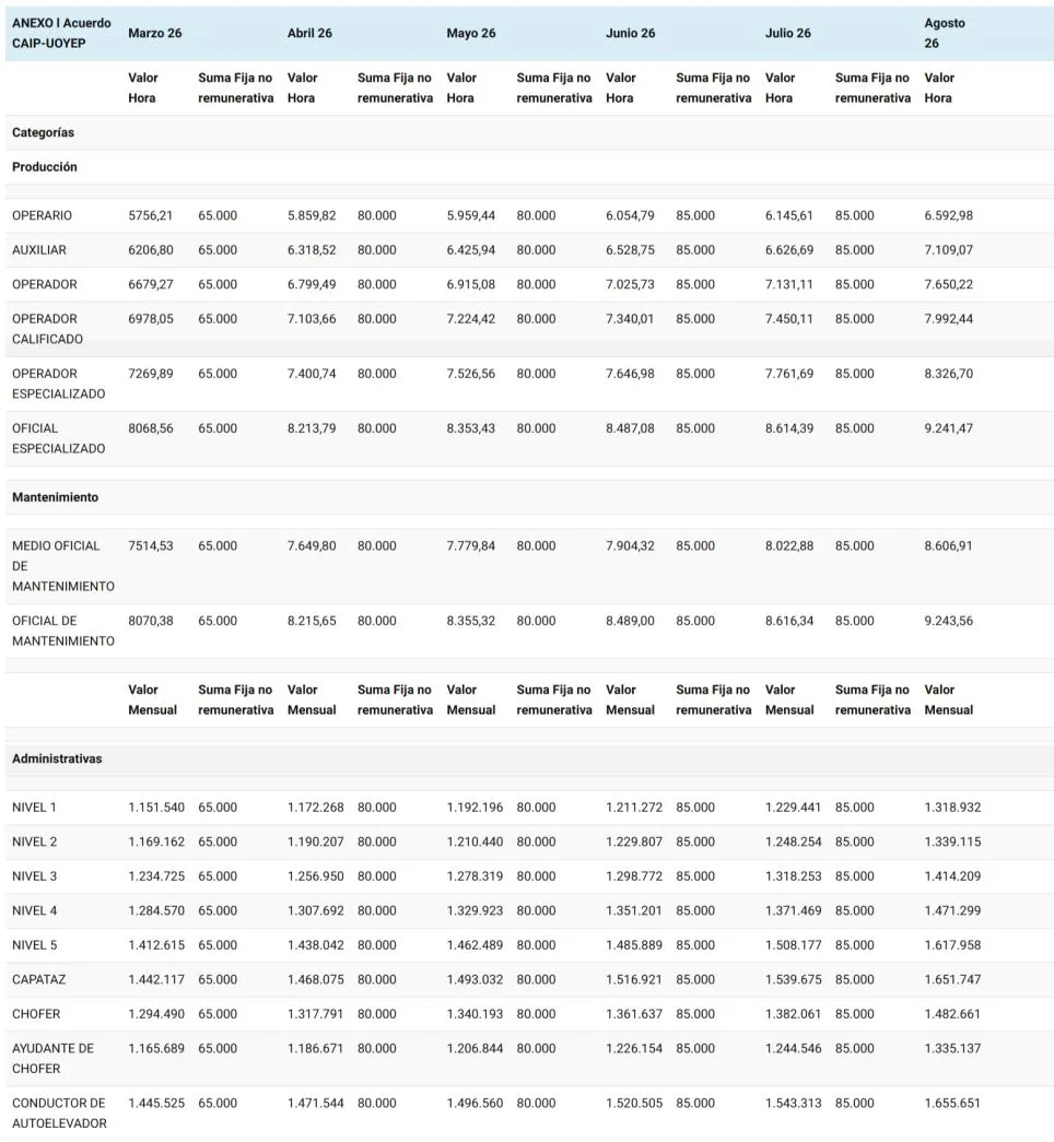 Para los salarios que se acreditan en los próximos días, se destacan los siguientes valores para el personal de Producción y Mantenimiento, por hora y Administración, valor mensual, sumado a una Suma Fija No Remunerativa de $65.000 para todas las categorías