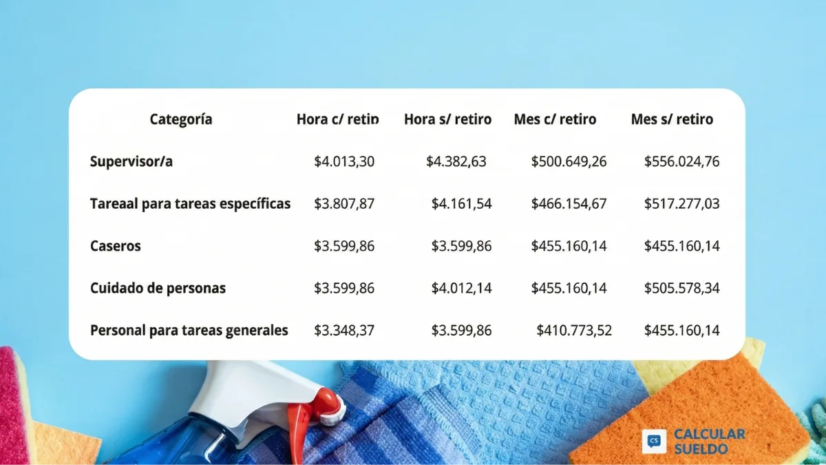 | Categoría | Hora c/ retiro | Hora s/ retiro | Mes c/ retiro | Mes s/ retiro |